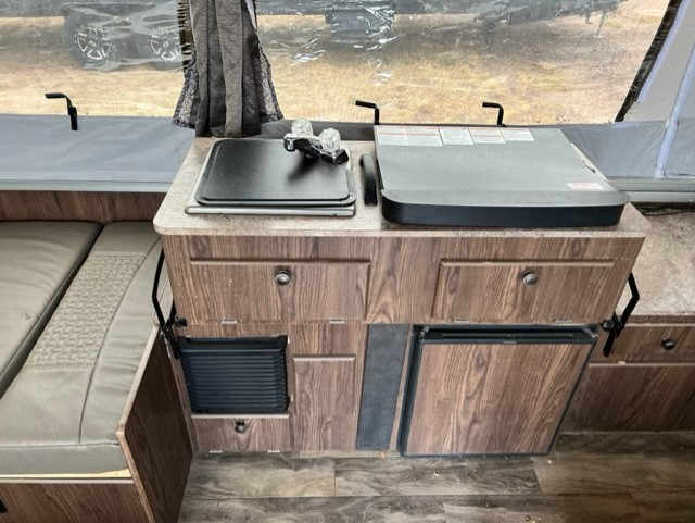 The Kitchen/Living – vinyl flooring, 3-burner cooktop, a fridge, and storage